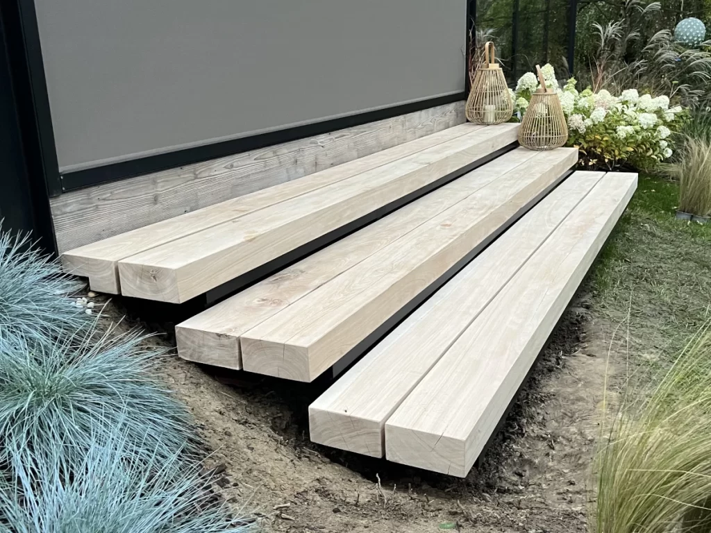 Minimalistické vstupní schodiště z masivního dřeva, které vyniká čistotou tvaru a precizním detailem. Každý stupeň je navržen tak, aby přirozeně navazoval na okolní terén a architekturu domu.